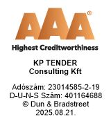 A KP TENDER Consulting Kft. a Dun & Bradstreet A Tanúsítványát kapta meg, mely azt jelzi, hogy velünk történő üzleti kapcsolat kialakításának pénzügyi kockázata alacsony.